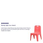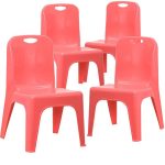 Set of 4 Plastic School Chairs 110 lb. Static Load Capacity Stack Quantity: 15 Lightweight Design Designed to encourage proper sitting habits Primary colors support early childhood development Red Polypropylene Plastic Shell Contoured One-Piece Shell No Metal Parts prevent injuries to small children Recommended for Preschool – Kindergarten Ages